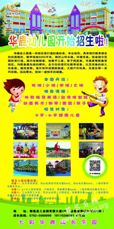 园所介绍: 华鹿幼儿园是一所投巨资打造的高标准、专业规范、具有现代教育理念的优质园所,教学场地5000平米,园所山环水绕、环境优美。按省级示范园标准打造,园内有舞蹈室、创意手工室、亲子阅览室、书画室等配套活动区,均配备最先进的硬件,全方位的现代化教学设备,以及完备的幼儿休息室、盥洗室等。室外有环保塑胶跑道,大型户外玩具、休息区等一系列设施,远远看去,宛如一座快乐的城堡。 地址:都昌县工业园芙蓉大道2号(县教育局斜对面200米)招聘要求: 幼师1名:1.热心事幼教事业 ; 2.大专师范类优先,有经验者优先; 3.认真负责、性格开朗、有亲和力、有较强合作意识和沟通能力优先; 4.待遇优厚,录用后子女可按我园职工福利政策优惠入园。 保育老师1名: 1.热心事幼教事业 ; 2.认真负责、性格开朗、有亲和力、有较强合作意识和沟通能力优先; 3、有经验者优先; 4.待遇优厚,录用后子女可按我职工福利政策优惠入园。 有意者请电联:18162260311(赵园长)18170286161(刘园长)