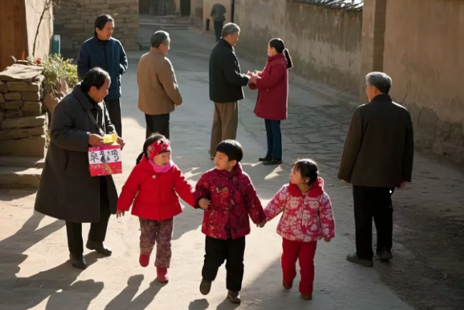 八十年代前春节走亲戚……文/冯期武 想起八十年代前的春节走亲戚,那仿佛是一场漫长而温馨的旅程,足足一个星期都走不完。如今住在小区几年甚至十几二十年,连对门邻居姓甚名谁都不知道,那些挎着篮子、踩着积雪走亲戚的日子,竟成了遥远的回忆。 那时的年味,是从腊月就开始酝酿的。一进腊月二十,家家户户便开始蒸年糕、煎豆折、做年豆腐、踩麻糖……,那是一项大工程。推磨磨面时,磨担抵在胸前,双手紧握,一圈圈地推拉,心里想着年糕、豆折、豆腐的香甜,便不觉得累了。蒸年糕时,雾气缭绕的厨房里,奶奶和母亲把白白胖胖的大年糕拾到筳盖子上,那香气至今难忘。这些年糕(还有豆折、麻糖之类),切好后,一个个排进纸箱、瓷瓮,盖上包袱皮(盖子,年糕则要放进放了清水的缸子里存储),便是年后走亲戚(或招待客人)的主要礼物。 初二一早,家家户户便开始了“出门儿”(老家方言称走亲戚为“出门”)。篮子(或手提袋)里装上自家蒸的年糕(通常是两条),再加上一包用纸线绳捆好的点心,条件好些的还会备上两瓶酒,礼物便备齐了。那时走亲戚,讲究的是“外甥走外婆家,闺女携婿走娘家”,次序分明。有俗语说“初一拜谱(族谱),初二拜母(外婆家),初三初四拜丈母……”,但后来也多演变为“先看丈人再看舅”。 走亲戚靠的大多是步行,近的四五里,远的二三十里,都靠一双脚板。孩子们兴高采烈庇颠庇颠地跟着,或是帮大人撅搭篮子,或是被父母用扁担挑着,一头是礼物,一头是崽女。雪天山路难行,深一脚浅一脚,摔个跤也赶紧护好提包,到了亲戚家成了“雪孩子”,惹得亲戚心疼地一把搂进怀里。后来条件好些,有人借来自行车,后座绑着装满礼物的长口袋,一天能赶三家亲戚,已是了不得的效率。 到了亲戚家,仪式感才是真正的年味。进门先不吭声,在外间屋家堂前跪地磕头拜见祖先。长辈一般坐在炕上等着,这份礼节来不得半点虚假。然后主人家便热情地递烟泡茶,孩子们能得到糖果、抓果。一顿丰盛的午餐是招待客人的重头戏。通常男人先上桌,女人们忙碌着炒菜……。虽然菜品无非是熏肉、鱼干、香肠之类,但在物质匮乏的年代,已是倾其所有。主人总谦虚地说“没什么好吃的”,客人却心满意足。有趣的是,客人往往吃得“文雅”,盘里的肉菜总会留下一半,因为大家都清楚,屋里还有几双小眼睛正火辣辣地盼着。 待客的饭食也颇有讲究:“迎客吃面条,送客吃饺子”。说是面条像绳子,能绊住客人的腿,多住几天;饺子像元宝,客人要远行,祝他出门发财。这份寓意里,满是质朴的情谊。 那时走亲戚,一份礼物往往承载着多家亲情。常见的景象是:一家来了客,这家人便用客人带来的礼物,原封不动地再去走另一家亲戚。一块肉、两瓶罐头,可能一天之内转好几个村子,串好几家亲戚,甚至有时转一圈又回到了起点。有的家庭买不起肉,还会向收到肉礼的邻居借来肉去走亲戚,事后有了再还。这种“串亲戚”的现象,是那个物质紧俏年代特有的互助与智慧。 孩子们盼走亲戚,不仅为那顿好饭,也为那难得的自由和过门钱(或压岁钱)。在亲戚家,孩子们可以尽情玩耍,打扑克、捡鞭炮。大人给的压岁钱,不过几毛钱,却能让孩子们高兴半天,尽管这钱多半最后要被父母“保管”起来,说是交学费。 如果路途遥远,或者谈得投机,客人常会被挽留住宿。主人会提前浆洗被褥,铺上干净柔软的稻草。孩子们和表亲们挤在一张床上,毫无隔阂。夜晚,大人们继续围着灯火“啦闲呱”,家常里短中,亲情愈加深厚。那份不紧不慢的交往,让正月里的每一天都充满了酒菜饭香和鞭炮火药味混合的独特年味。 如今,生活便捷了,走亲戚却成了“串门儿”,甚至像“送快递”。礼物超市选购,放下礼物,说几句话便匆匆离开。亲戚多的,开车一天能走四五家甚至七八家。过去的“笼笼来,笼笼去”变成了现在的“亲情快递”。再后来,就是微信拜年、“红包”送礼…… 我住在城里的小区已有好几年了,单元楼里安静得只剩下关门声(记得在老家时,同村几十户甚至上百人家都认识,老少都能叫得上名字)。想起八十年代前走亲戚的情景,那份浓得化不开的人情味,那份需要整整一个星期甚至更长时间才能慢慢品味的春节,才恍然发觉,我们得到的很多,但失去的,或许也同样珍贵。