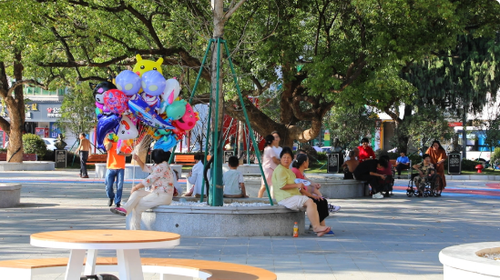 走进街心公园,处处洋溢着欢乐惬意的氛围。头发花白的老人们搬着小马扎围坐成圈,蒲扇在手中轻轻摇晃,送来阵阵清凉;他们慢悠悠聊起家常琐事,话语里满是