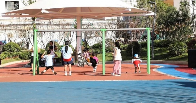 儿童乐园区域则是另一番热闹场景。孩子们三五组队,在滑梯上追逐嬉戏;一旁的秋千架上,孩童紧抓绳索高高荡起,小脸上满是灿烂笑容,活泼的身影为公园增添了无限生机。